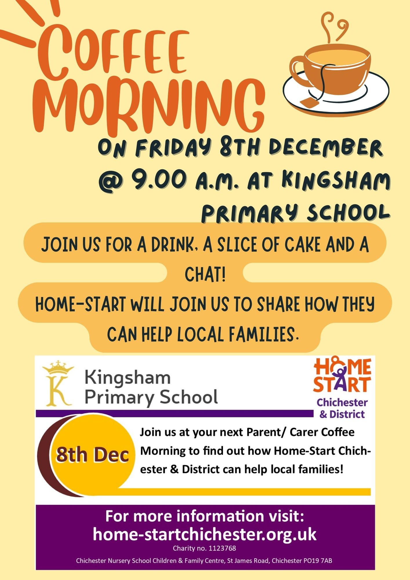 On Friday 8th December, we will be hosting a coffee morning for Parents and Carers at 9.00 A.M in the school hall. We will be joined by Home-Start who will share how they can support local families. This session will be run by Sarah Twine (Pastoral Support Worker), Ian Williams (Deputy Head) and Fliss McHale (Thought-full practitioner). The aim is to provide a supportive group for Parents and Carers of children at Kingsham Primary School.