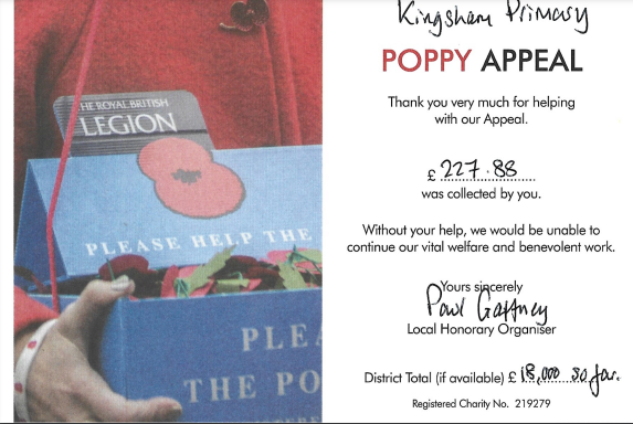 A huge thank you to everyone who supported the poppy appeal at Kingsham Primary School over recent weeks. As you will see from the certificate, we raised £227.88, contributing to a district total of over £18,000.