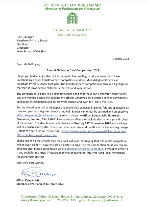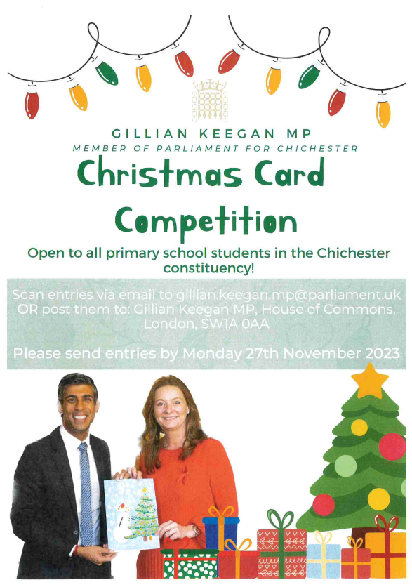 We have received a letter from Gillian Keegan, inviting us to take part in her annual Christmas card competition. If you would like to enter, please bring your entries to Mr Dallinger by this Friday. He will then scan the entries in and email to Gillian Keegan.