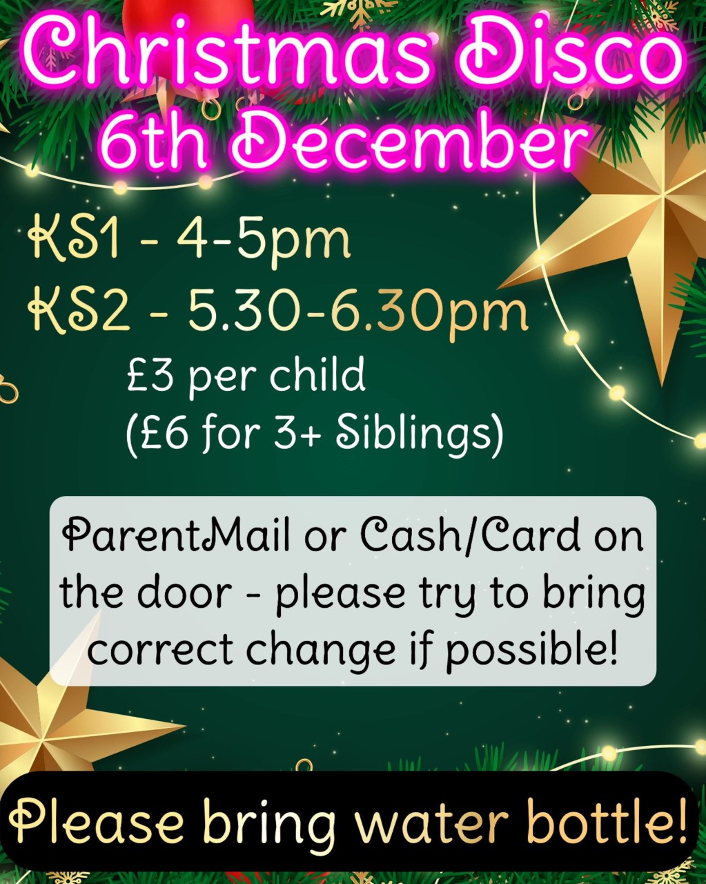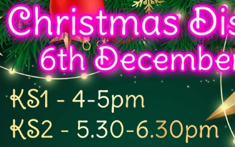 The Early Years and KS1 disco will be 4-5pm in the school hall and KS2 will be 5:30-6:30pm.