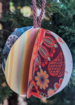 Then fold each circle in half and stick the backs together until they join up and form a bauble. Next attach a piece of wool, ribbon or string to form a hanging loop.