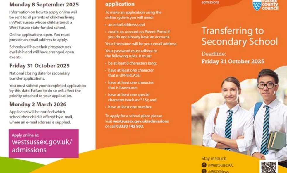 As I am sure you are aware, the deadline to apply for a secondary school place for our current Year 6 children is Friday 31st October. The leaflet below gives you all of the details to support with the applications process through West Sussex Admissions.