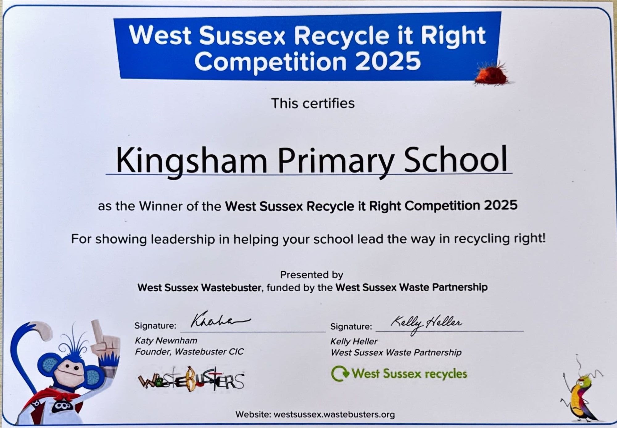 Primary schools across the county took take part in the Recycle It Right competition which is a free, fun, and easy way to boost recycling knowledge in the school community. Pupils completed the Recycle It Right quiz to earn points for our school and Kingsham successfully achieved first place!