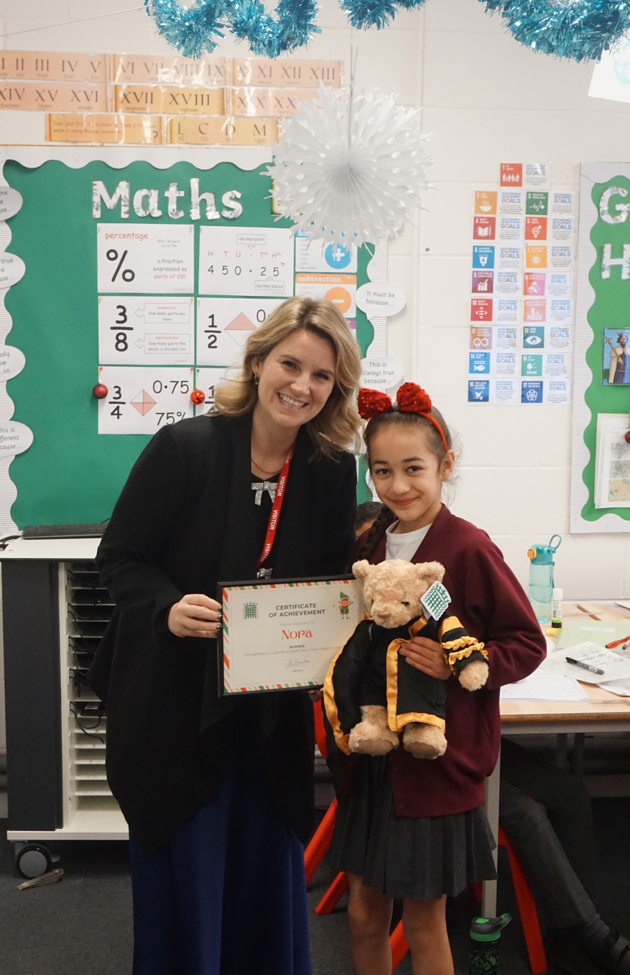 Nora had a lovely surprise on Friday when Jess Brown-Fuller MP came into Kingsham to award her with a certificate, a bear and a copy of her winning entry as a Christmas Card. Jess said that she had received so many entries and she asked for help from local artists to select a final four designs before asking people to vote on the final four. As you can see the photos, Nora was certainly surprised by the visit and delighted with her prizes.